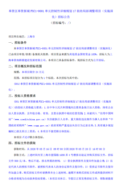 奉賢區(qū)奉賢新城FXC1-0001單元控制性詳細(xì)規(guī)劃17街坊局部調(diào)整項(xiàng)目(實(shí)施深化)