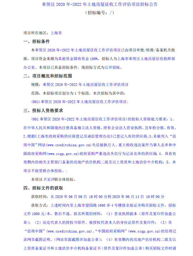 奉賢區(qū)2020年-2022年土地房屋征收工作評(píng)估項(xiàng)目-招標(biāo)公告