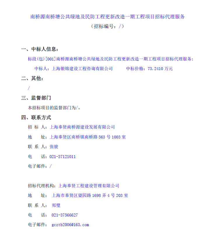 南橋源南橋塘公共綠地及民防工程更新改造一期工程項(xiàng)目招標(biāo)代理服務(wù)中標(biāo)公示