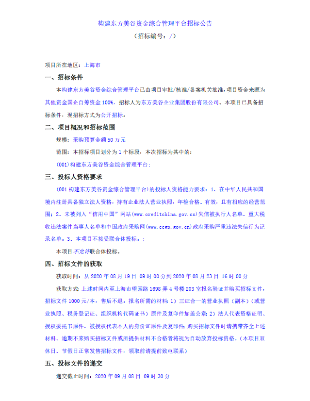 構(gòu)建東方美谷資金綜合管理平臺招標(biāo)公告