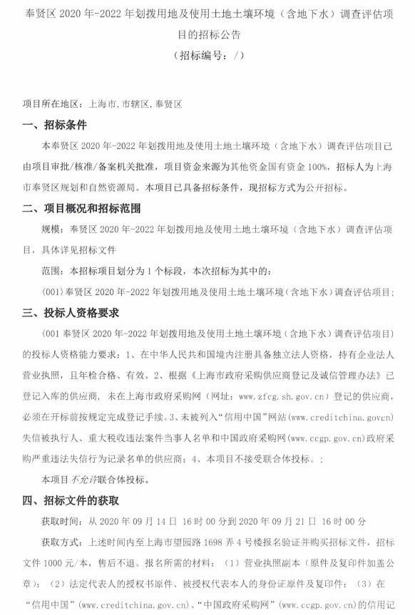 奉賢區(qū)2020年-2022年劃撥用地及使用土地土壤環(huán)境(含地下水)調(diào)查評估項目的招標公告