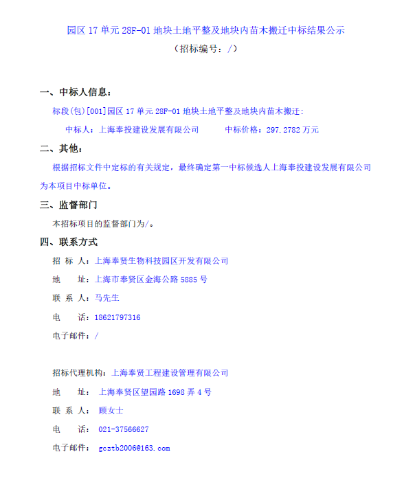->園區(qū) 17 單元 28F-01 地塊土地平整及地塊內(nèi)苗木搬遷中標(biāo)公告