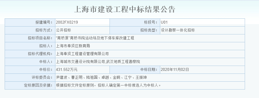 “南橋源”南橋書院運動場及地下停車庫改建工程勘察設計一體化招標中標公告