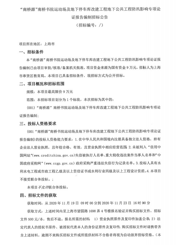 ->“南橋源”南橋書院運(yùn)動場及地下停車庫改建工程地下公共工程防汛影響專項(xiàng)論 證報(bào)告編制招標(biāo)公告