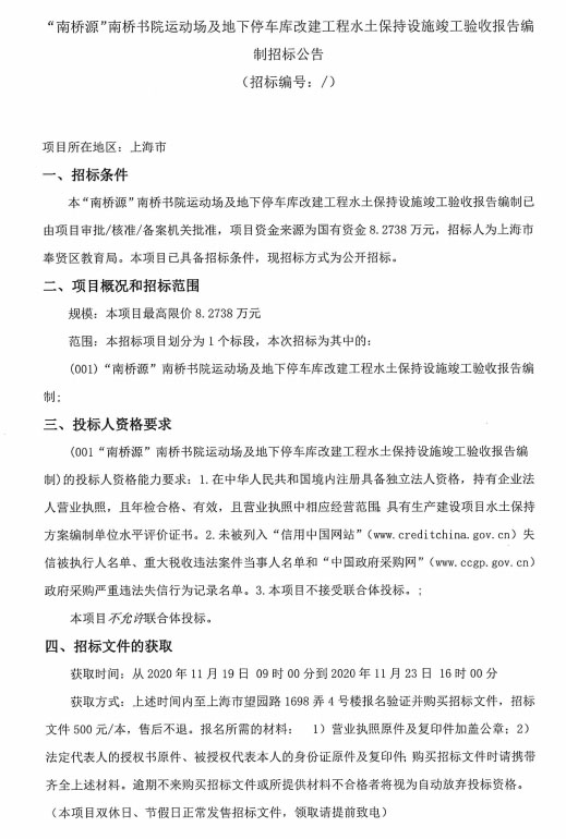 ->“南橋源”南橋書院運(yùn)動(dòng)場及地下停車庫改建工程水土保持設(shè)施竣工驗(yàn)收報(bào)告編制招標(biāo)公告