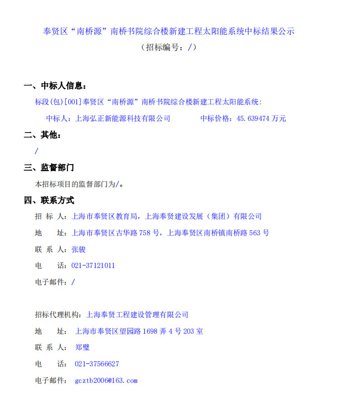 ->奉賢區(qū)“南橋源”南橋書院綜合樓新建工程太陽能系統(tǒng)中標(biāo)結(jié)果公示