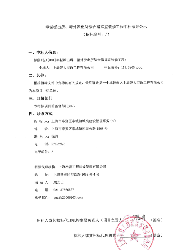 ->奉城派出所、塘外派出所綜合指揮室裝修工程中標(biāo)結(jié)果公示