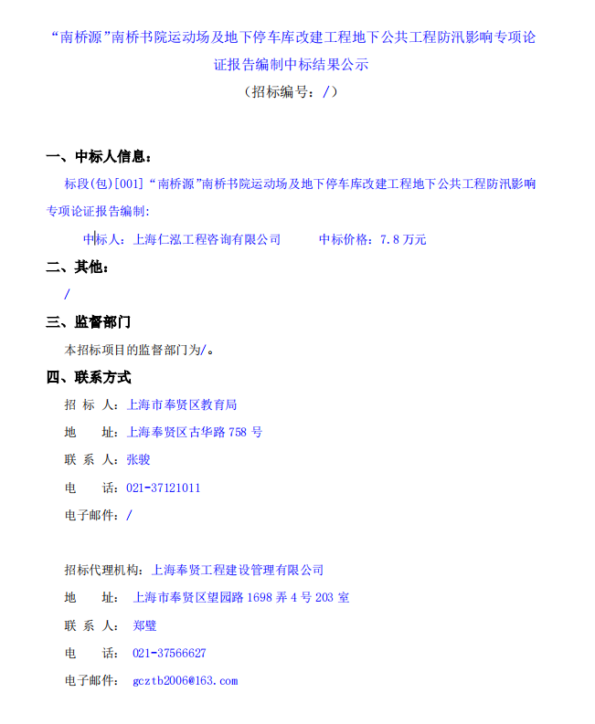 ->“南橋源”南橋書院運動場及地下停車庫改建工程地下公共工程防汛影響專項論證報告編制中標結果公示