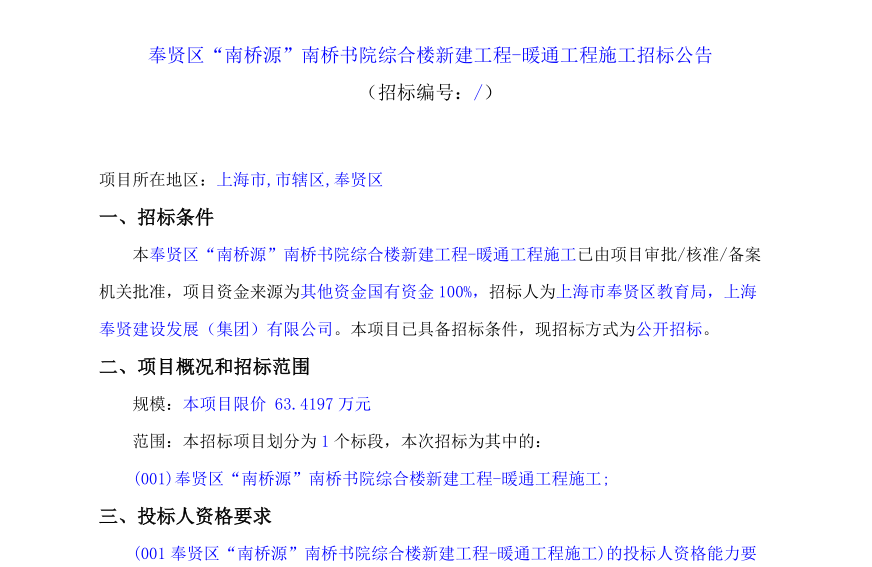 奉賢區(qū)“南橋源”南橋書(shū)院綜合樓新建工程-暖通工程施工 招標(biāo)公告
