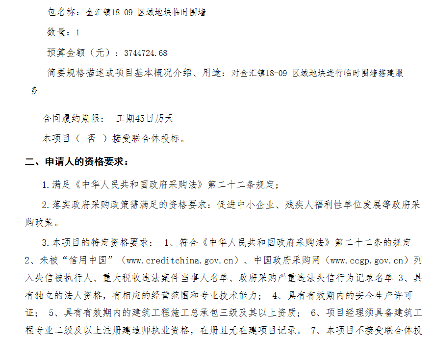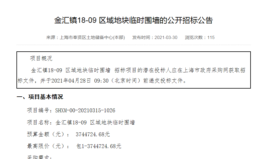 金匯鎮(zhèn)18-09 區(qū)域地塊臨時(shí)圍墻的招標(biāo)公告