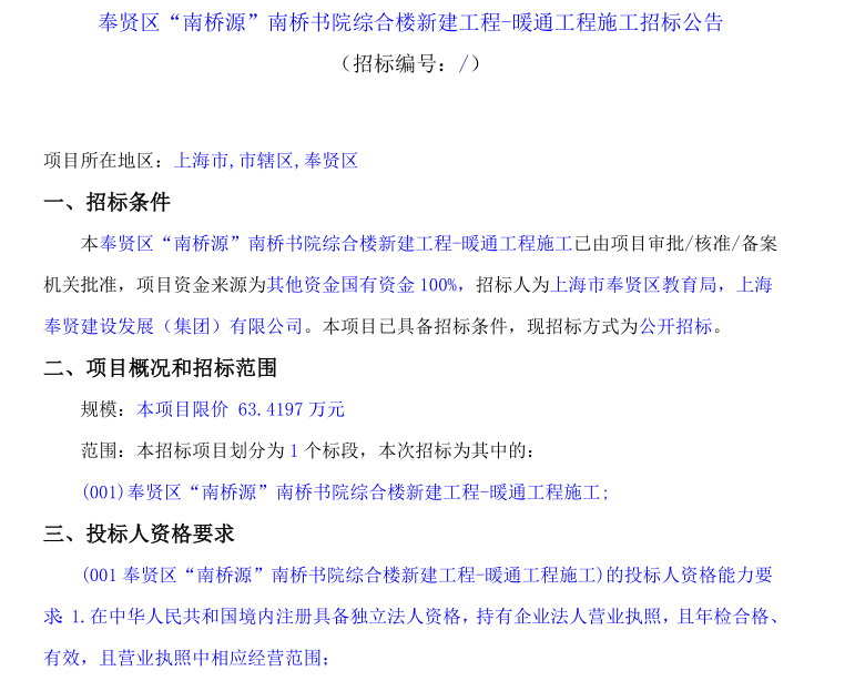 奉賢區(qū)“南橋源”南橋書院綜合樓新建工程-暖通工程施工 招標公告