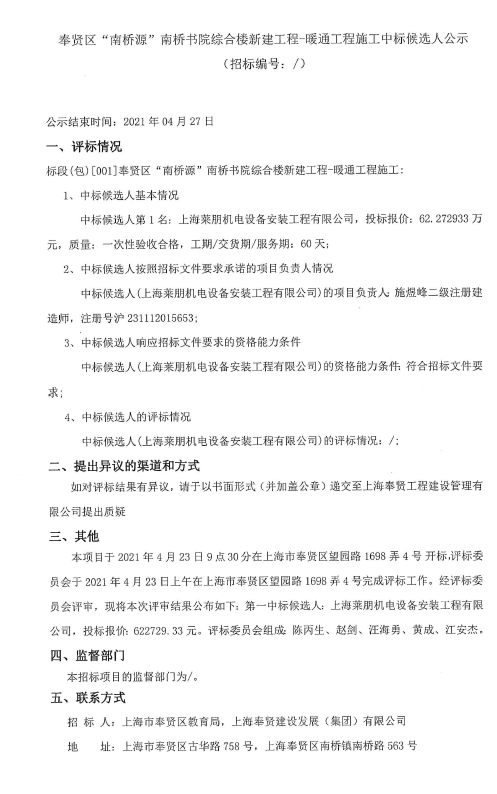 奉賢區(qū)“南橋源”南橋書院綜合樓新建工程-暖通工程施工 中標公告