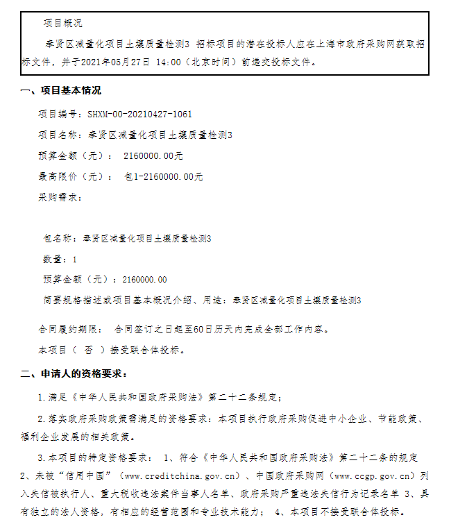 奉賢區(qū)減量化項(xiàng)目土壤質(zhì)量檢測(cè)3招標(biāo)公告