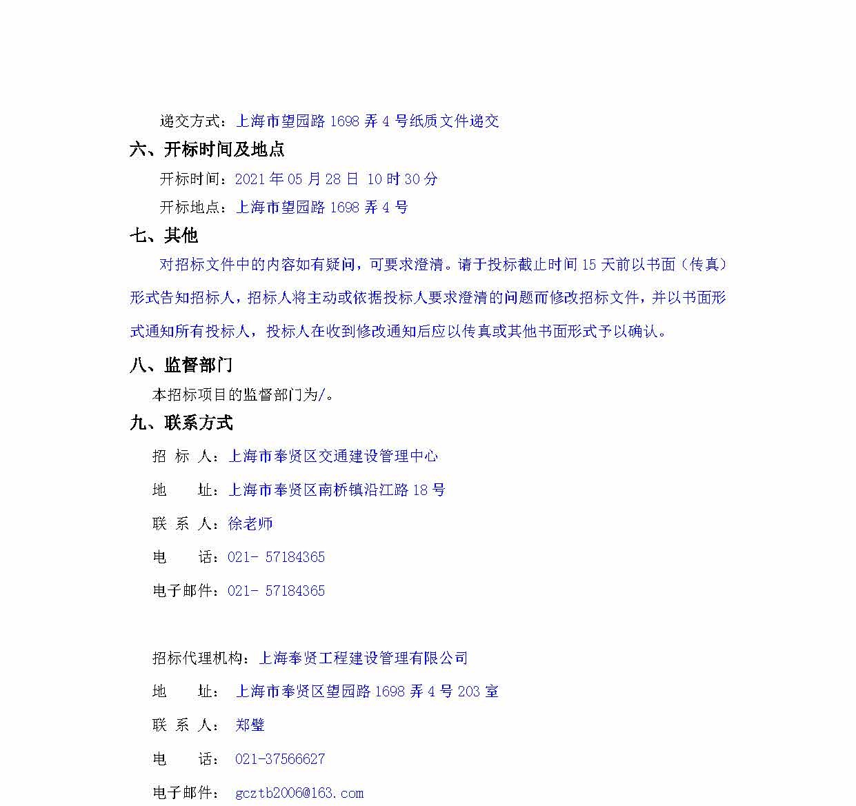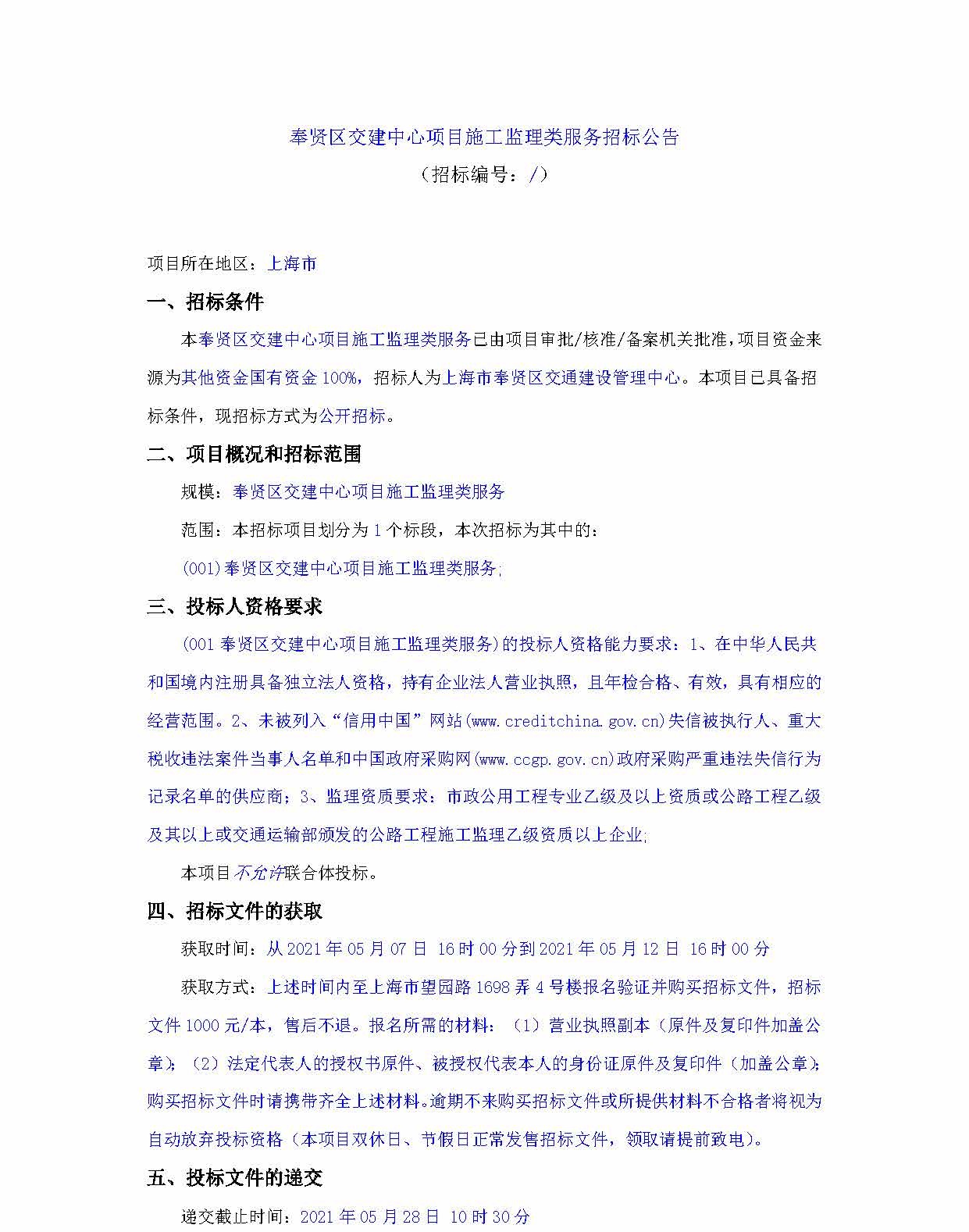 奉賢區(qū)交建中心項目施工監(jiān)理類服務招標公告