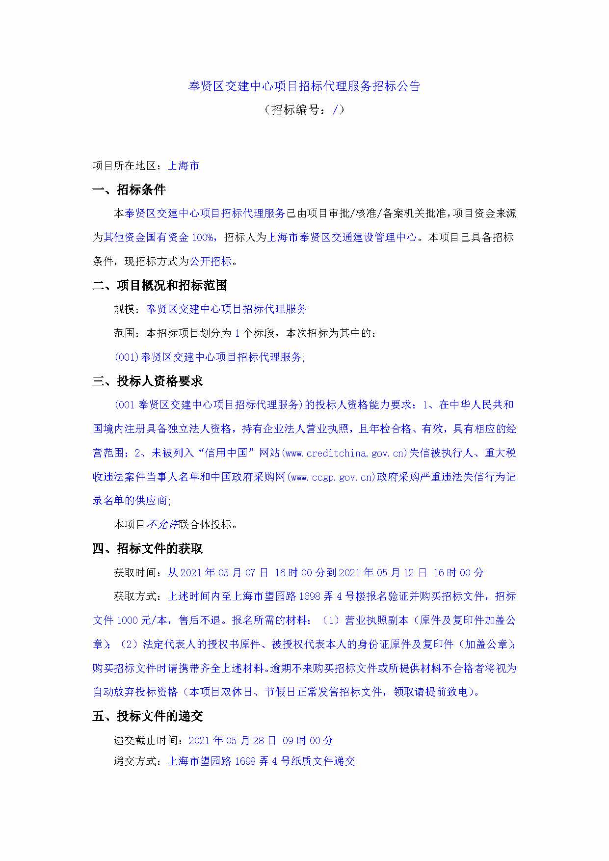 ->奉賢區(qū)交建中心項目招標代理服務 招標公告