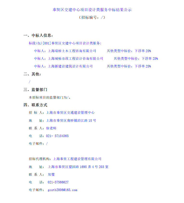 ->奉賢區(qū)交建中心項(xiàng)目設(shè)計(jì)類(lèi)服務(wù)中標(biāo)結(jié)果公示