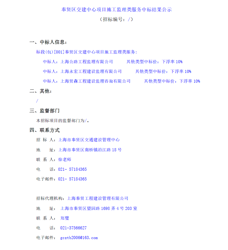奉賢區(qū)交建中心項(xiàng)目施工監(jiān)理類服務(wù)中標(biāo)結(jié)果公示