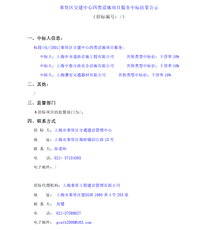 奉賢區(qū)交建中心四類設(shè)施項目服務(wù)中標(biāo)結(jié)果公示