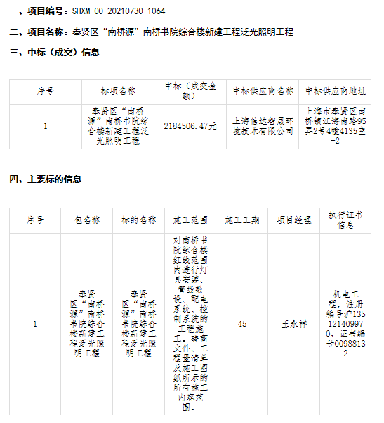 奉賢區(qū)“南橋源”南橋書院綜合樓新建工程泛光照明工程的中標(biāo)成交結(jié)果公告