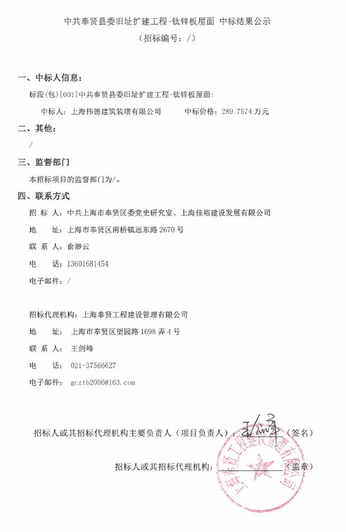 中共奉賢縣委舊址擴(kuò)建工程-鈦鋅板屋面 中標(biāo)結(jié)果公告