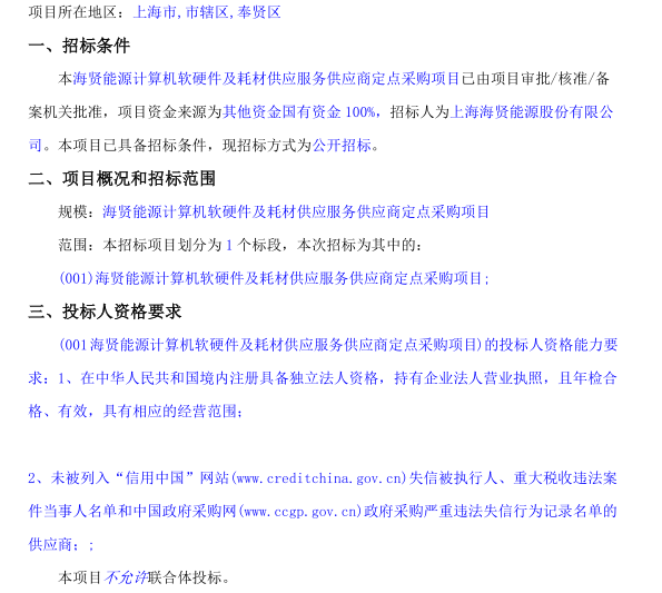 海賢能源計(jì)算機(jī)軟硬件及耗材供應(yīng)服務(wù)供應(yīng)商定點(diǎn)采購項(xiàng)目招標(biāo)公告
