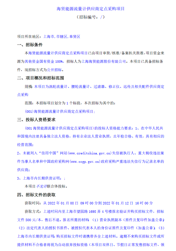 海賢能源流量計(jì)供應(yīng)商定點(diǎn)采購(gòu)項(xiàng)目招標(biāo)公告