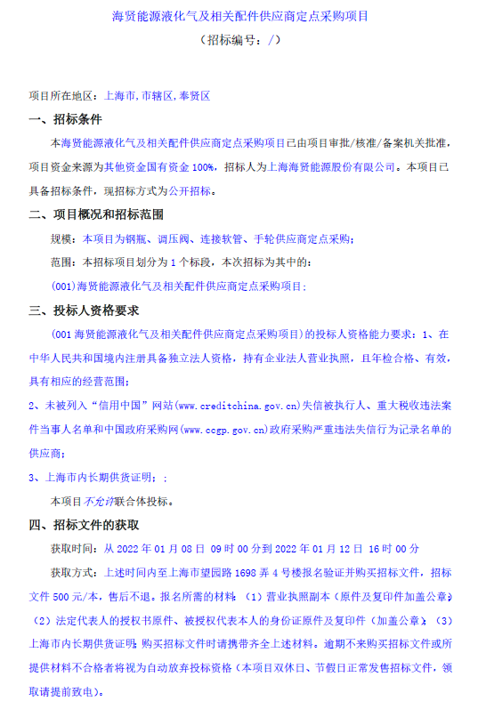 海賢能源液化氣及相關(guān)配件供應(yīng)商定點(diǎn)采購項(xiàng)目招標(biāo)公告