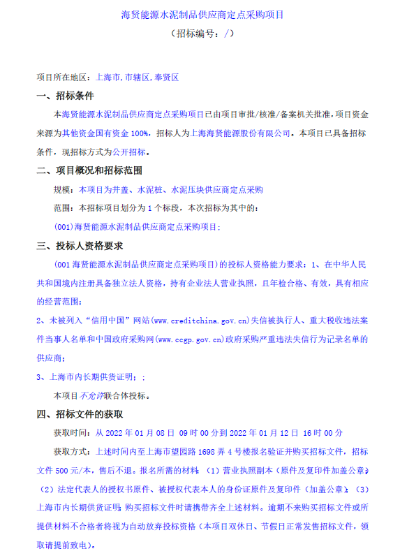 海賢能源水泥制品供應(yīng)商定點(diǎn)采購(gòu)項(xiàng)目招標(biāo)公告