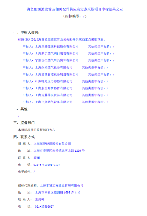 海賢能源波紋管及相關(guān)配件供應(yīng)商定點(diǎn)采購(gòu)項(xiàng)目中標(biāo)結(jié)果公示