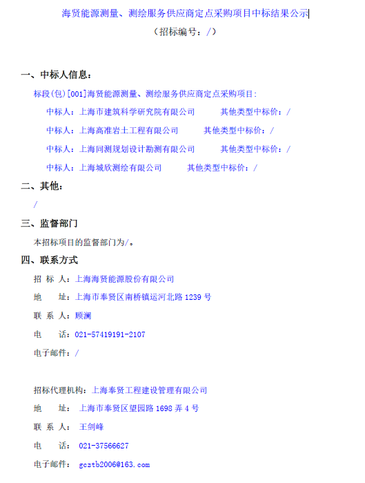 ->海賢能源測量、測繪服務(wù)供應商定點采購項目中標結(jié)果公示
