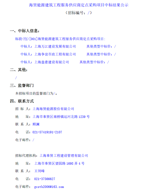 海賢能源建筑工程服務(wù)供應(yīng)商定點(diǎn)采購項(xiàng)目中標(biāo)結(jié)果公示