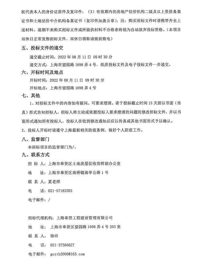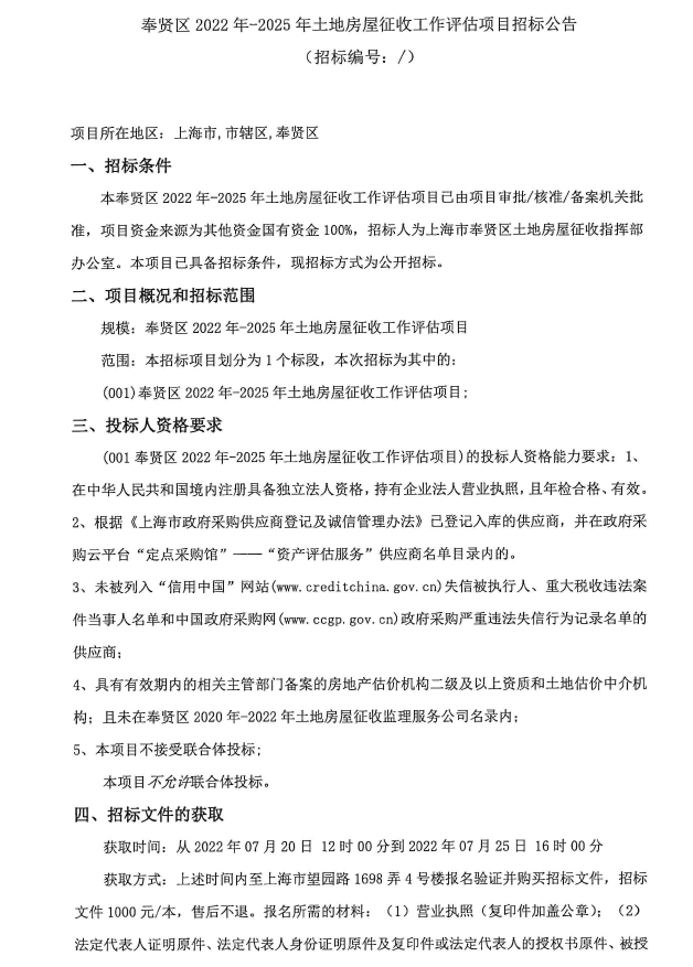 奉賢區(qū)2022年-2025年土地房屋征收工作評(píng)估項(xiàng)目招標(biāo)公告