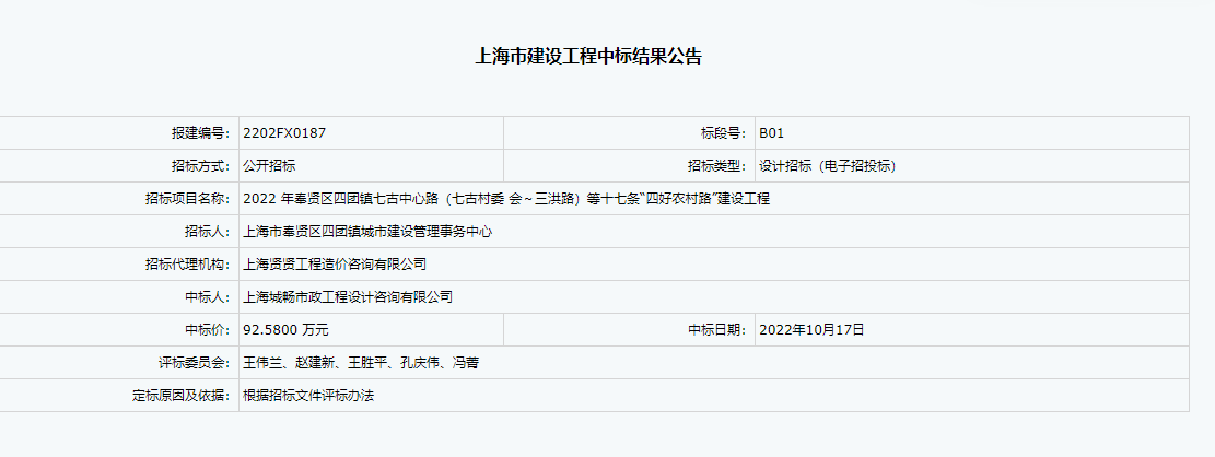 2022年奉賢區(qū)四團(tuán)鎮(zhèn)七古中心路(七古村委會(huì)~三洪路)等十七條“四好農(nóng)村路”建設(shè)工程設(shè)計(jì)中標(biāo)結(jié)果公告
