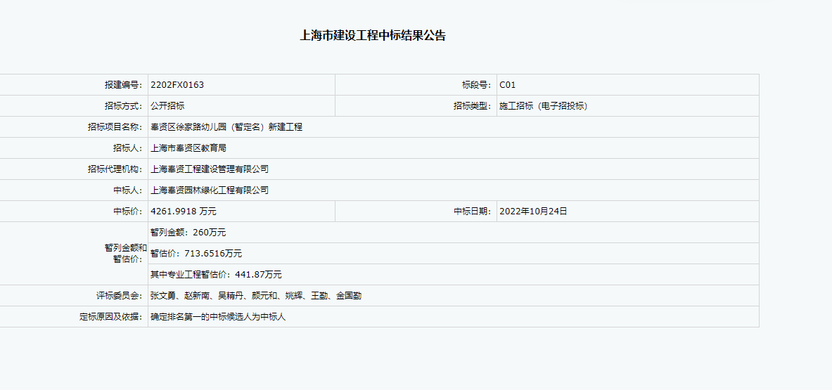 ->奉賢區(qū)徐家路幼兒園(暫定名)新建工程施工招標(biāo)中標(biāo)結(jié)果公告