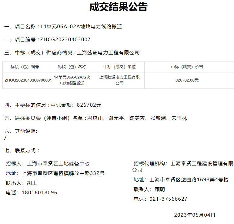 ->14單元06A-02A地塊電力線路搬遷成交結(jié)果公告