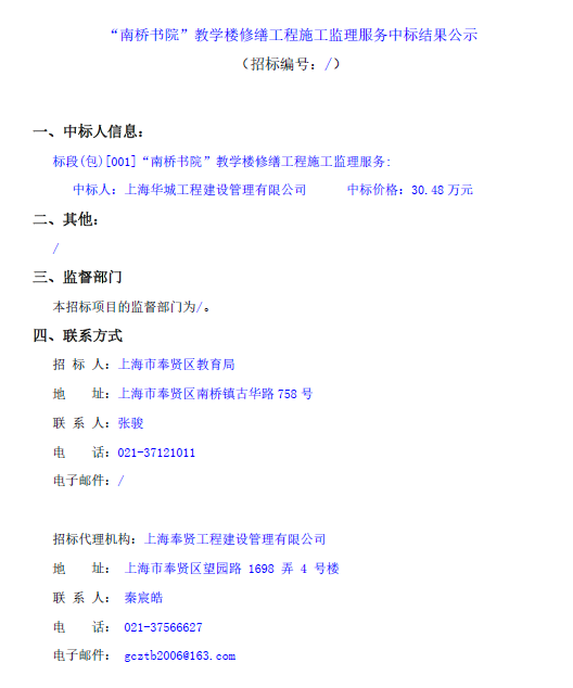 ->"南橋書院”教學樓修繕工程施工監(jiān)理服務中標結果公示