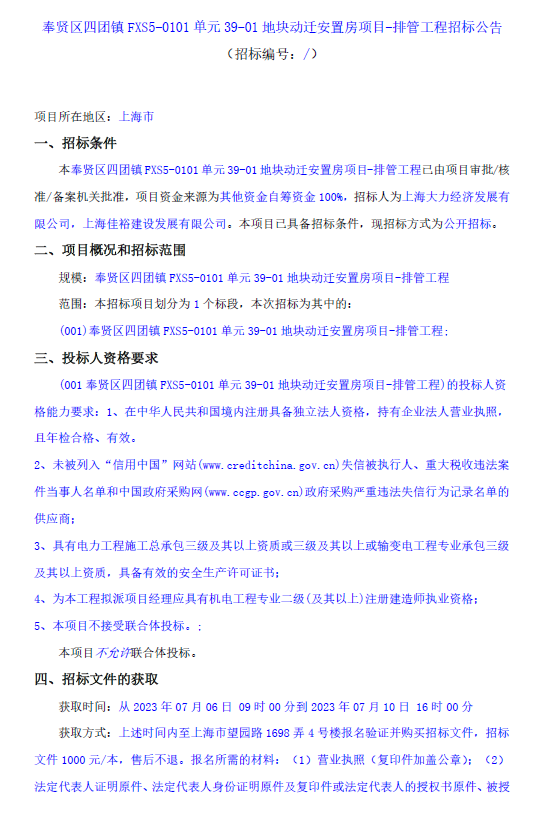 ->奉賢區(qū)四團鎮(zhèn)FXS5-0101 單元39-01 地塊動遷安置房項目-排管工程招標(biāo)公告