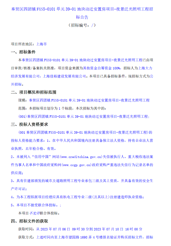->奉賢區(qū)四團(tuán)鎮(zhèn)FXS5-0101 單元39-01 地塊動(dòng)遷安置房項(xiàng)目-夜景泛光照明工程招標(biāo)公告