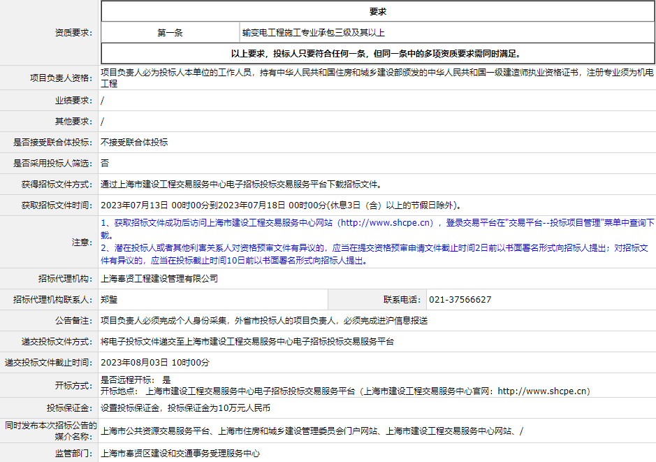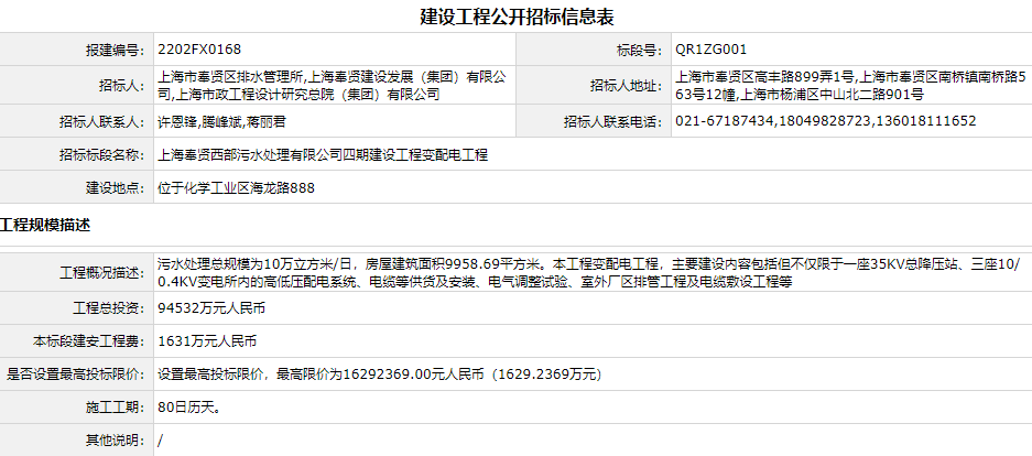 ->上海奉賢西部污水處理有限公司四期建設(shè)工程變配電工程招標(biāo)公告
