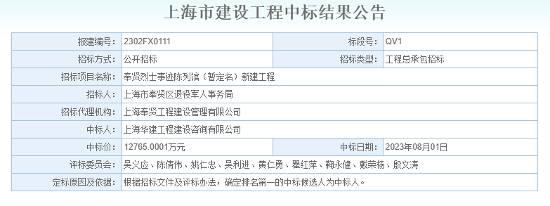 奉賢烈士事跡陳列館(暫定名)新建工程中標(biāo)結(jié)果公告