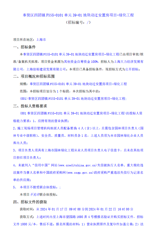 奉賢區(qū)四團鎮(zhèn)FXS5-0101單元39-01地塊動遷安置房項目-綠化工程招標(biāo)公告