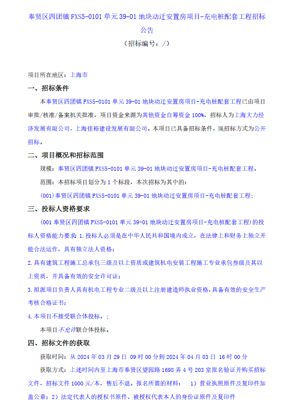 ->奉賢區(qū)四團(tuán)鎮(zhèn)FXS5-0101單元39-01地塊動(dòng)遷安置房項(xiàng)目-充電樁配套工程招標(biāo)公告