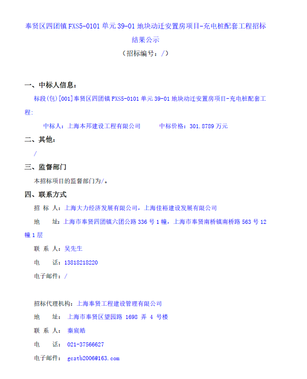 奉賢區(qū)四團(tuán)鎮(zhèn)FXS5-0101單元39-01地塊動遷安置房項(xiàng)目-充電樁配套工程招標(biāo)結(jié)果公示