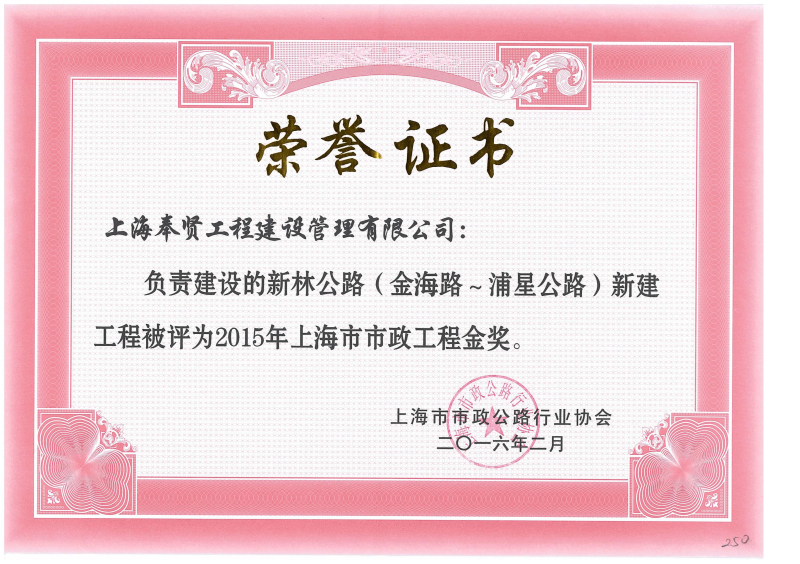 ->我公司負(fù)責(zé)建設(shè)的新林公路(金海路~浦星公路)新建工程獲得上海市市政工程金獎_