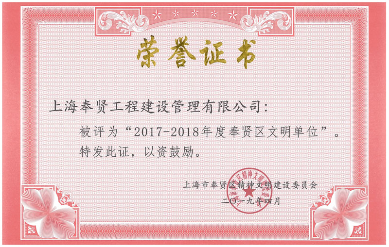 公司榮獲“2017-2018年度奉賢區(qū)文明單位”稱號_