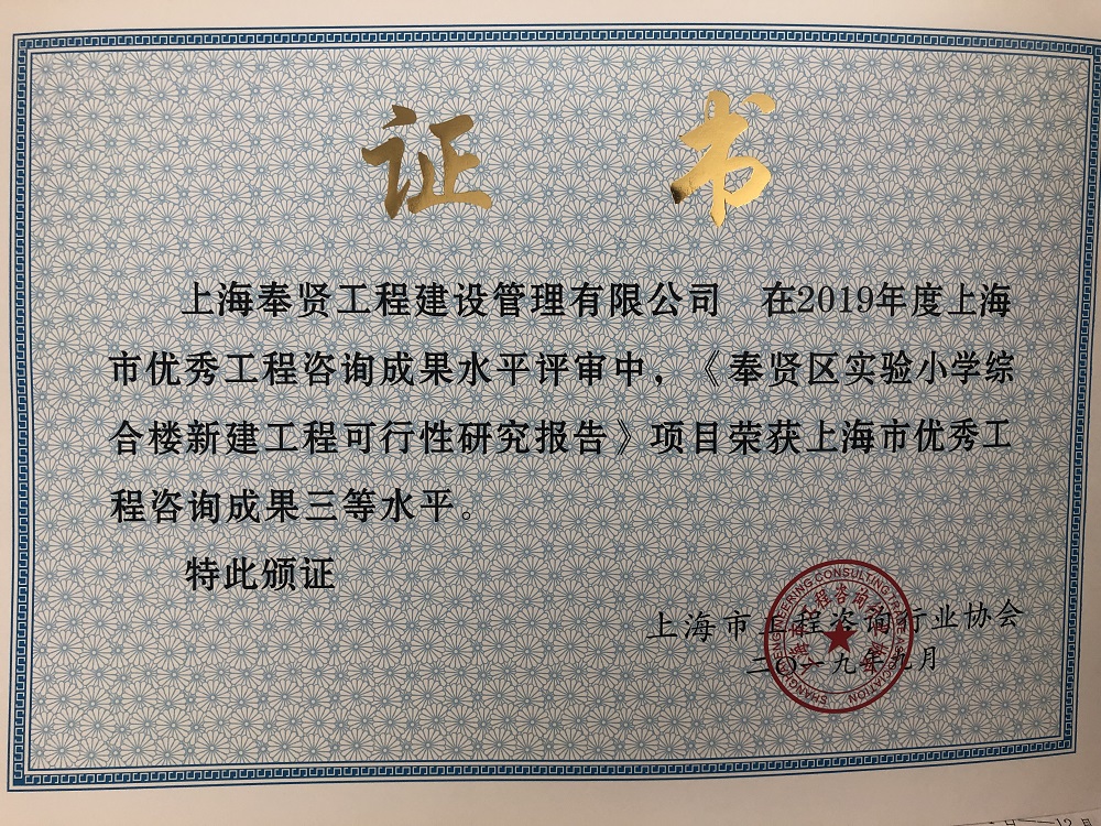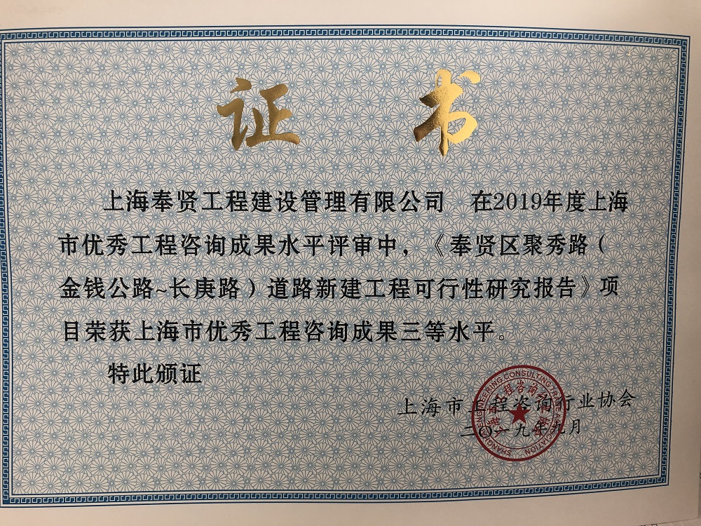上海市2019年優(yōu)秀工程咨詢成果評獎(jiǎng)結(jié)果揭曉,我公司編制的《奉賢區(qū)殯儀館新建工程可行性研究報(bào)告》榮獲2019年度上海市優(yōu)秀工程咨詢成果二等獎(jiǎng);《奉賢區(qū)實(shí)驗(yàn)小學(xué)綜合樓新建工程可行性研究報(bào)告》和《奉賢區(qū)聚秀路(金錢公路~長庚路)道路新建工程可行性研究報(bào)告》榮獲2019年度上海市優(yōu)秀工程咨詢成果三等獎(jiǎng)。