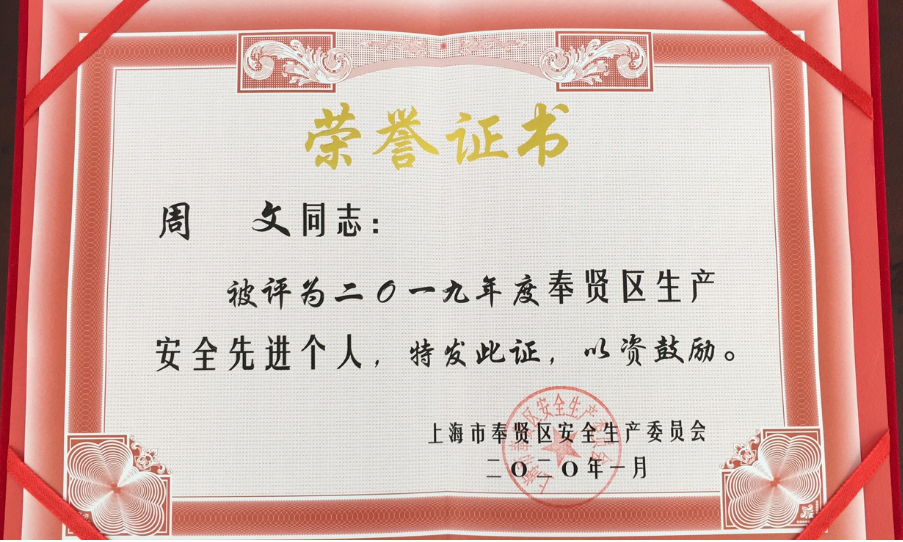 周文榮獲2019年度奉賢區(qū)安全生產(chǎn)先進個人。